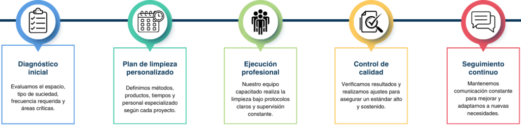 Nuestra estrategia se basa en entender a fondo cada espacio antes de limpiarlo. No creemos en soluciones genéricas: analizamos el tipo de instalación, el flujo de personas, los riesgos operativos y los estándares requeridos para diseñar un plan de limpieza eficiente y a la medida.